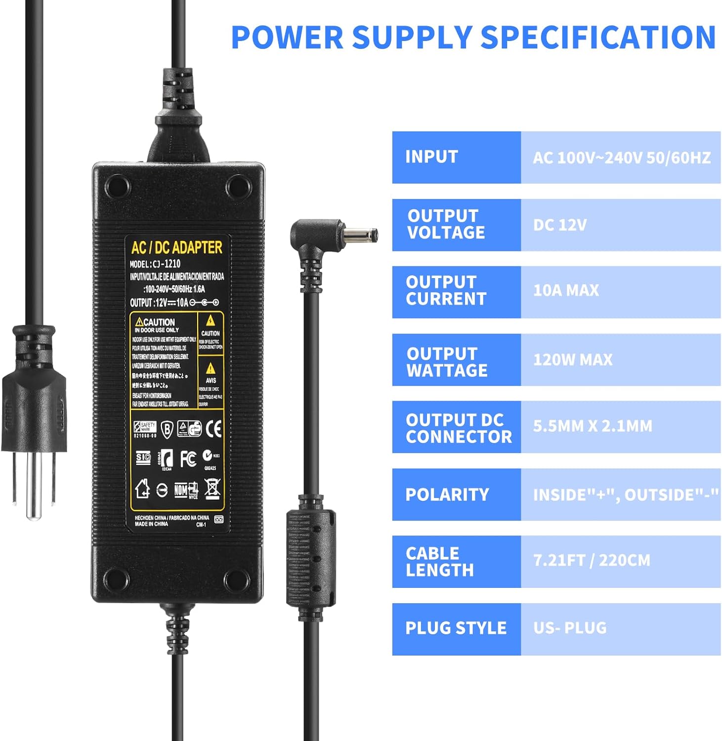 Name: 12V 10A Power Adapter;Input: AC 100V~240V 50/60Hz;Output Voltage: DC 12V;Output Current: 10A Max;Output Wattage: 120W Max;Output DC Connector: 5.5mm x 2.1mm;Polarity: Inside”+”, Outside”-“;Cable Length: 7.21ft / 220CM;Plug Style: US- Plug;Accessory: LED DC Jack;