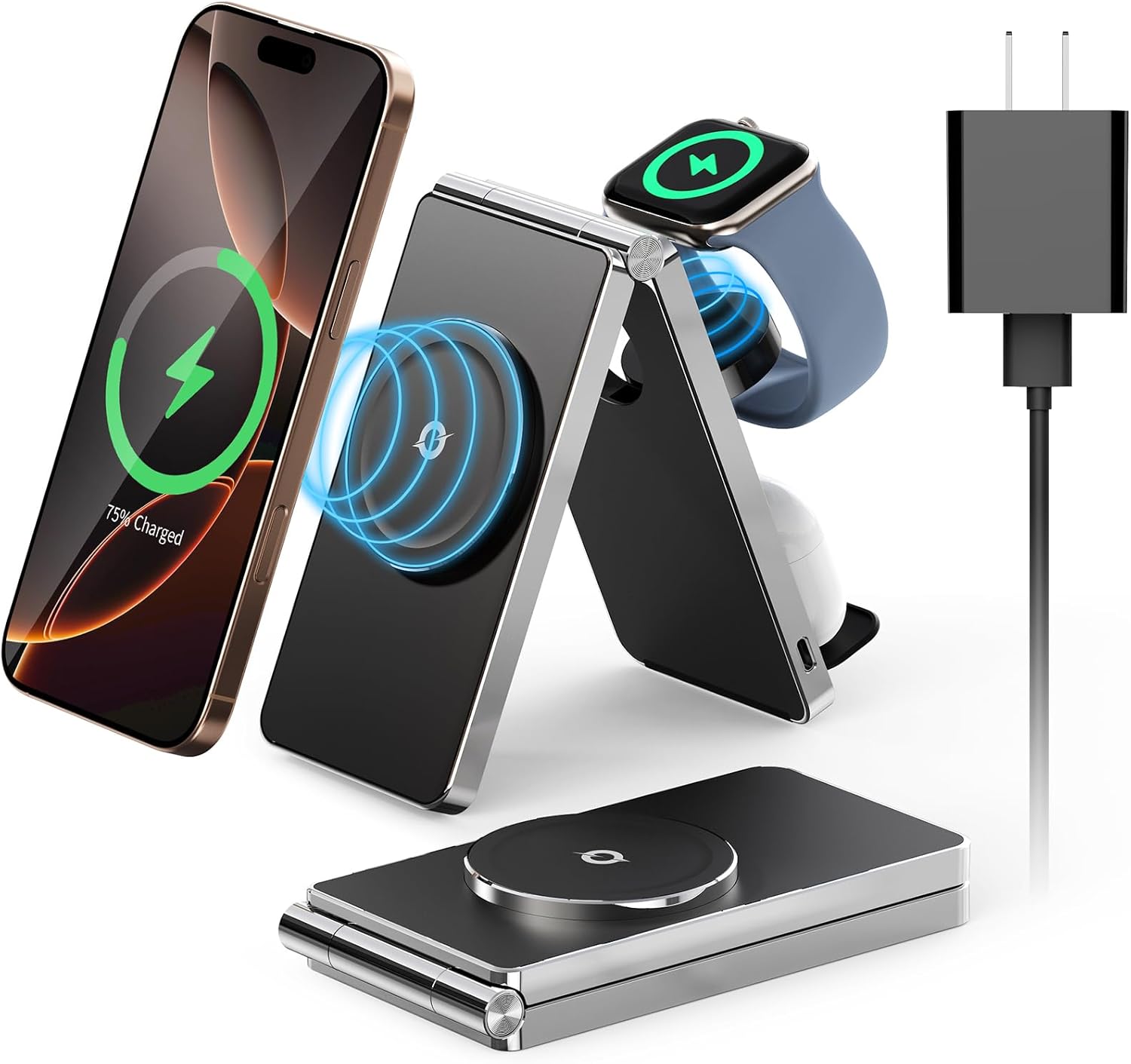 2025 Charging Station for Apple Multiple Devices – 3 in 1 Foldable Magnetic Wireless Charger Dock – Travel Charging Pad for iPhone 16 15 14 13 12 Pro Max Plus Watch & Airpods