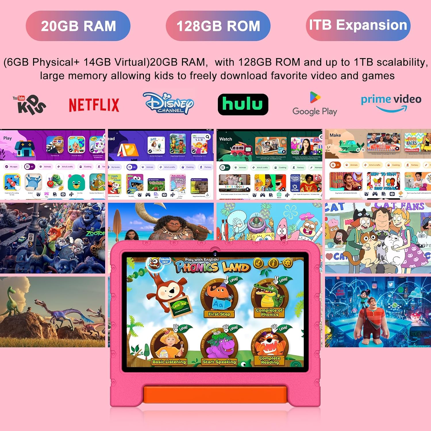 【20GB (6+14) RAM and 128GB Super ROM & 6000mAh Large Capacity Battery】 20GB ( 6GB Original + 14GB Expanded Virtual ) RAM + 128GB ROM (SD card expandable up to 1TB), it is able to run various apps compatibly and smoothly, and store your child’s favorite movies, photos and apps, such as Netflix,Kindle,Instagram,Disney+ and other daily required apps directly from the pre-installed play store to meet your child’s diverse learning and entertainment needs. Let kids enjoy math, language, music, painting in the game. Equipped with a large 6000mAh battery, giving your child a stable and continuous use experience.