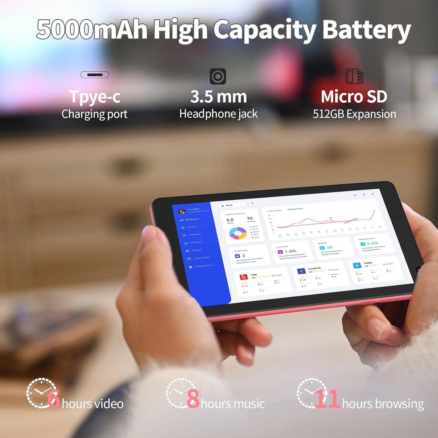 [GMS Certified]: Tablets PC has Google GMS certification and downloads needed apps from the Google Play store, such as Facebook, YouTube, and Netflix. It also comes with a 5000mAh battery for watching videos, working, listening to music and surfing the web with up to 8 hours of battery life.