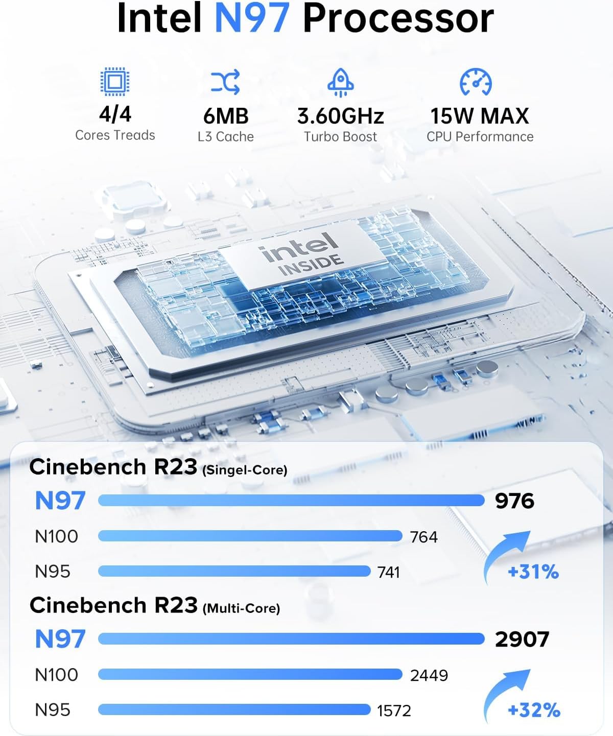 🔹[CPU: N97,which is faster and more powerful than the N100] – Mini PC V1 is powered by 2024 Latest In-tel 12th Gen processor Alder Lake-N97(4Cores/4 Threads, 6M In-tel Smart Cache, 2.0GHz, MAX TO 3.6GHz) , delivers more than 27% higher performance than N100(Reference from Cinebench R23). Performance at least +30%, GPU at least +21% compared with the previous CPU – N95/N5105/N5095. Remarkably power-efficient at 15W, it outperforms its predecessors, even rivaling some mainstream mobile processors from the past. Whether it’s for business, family entertainment, school, research, or social media, this mini PC has your needs covered!