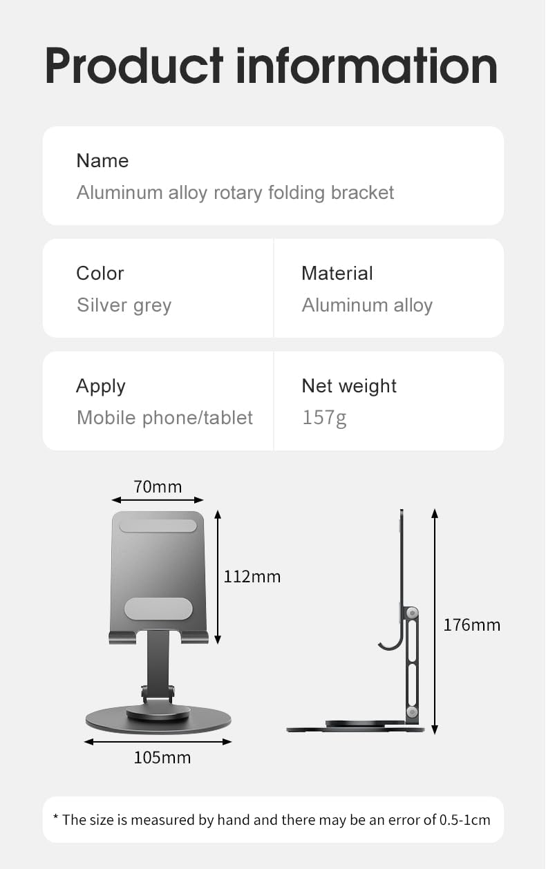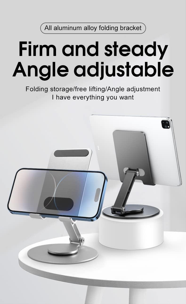This Aluminum Cell phone and tablet foldable 360° Rotationable holder has strong arms that move around and hold devices in different places. Made from Aluminum alloy, it can support machines from small to large, between 5 to 14 inches big. The arms can turn fully in a circle and the height and angle can change so you can find the best view. Its arms fold together to take up less space when traveling. The wide bottom and silicone non-slip coating keep everything from wobbling. This holder lets devices spin freely for relaxing with movies, games and books.
