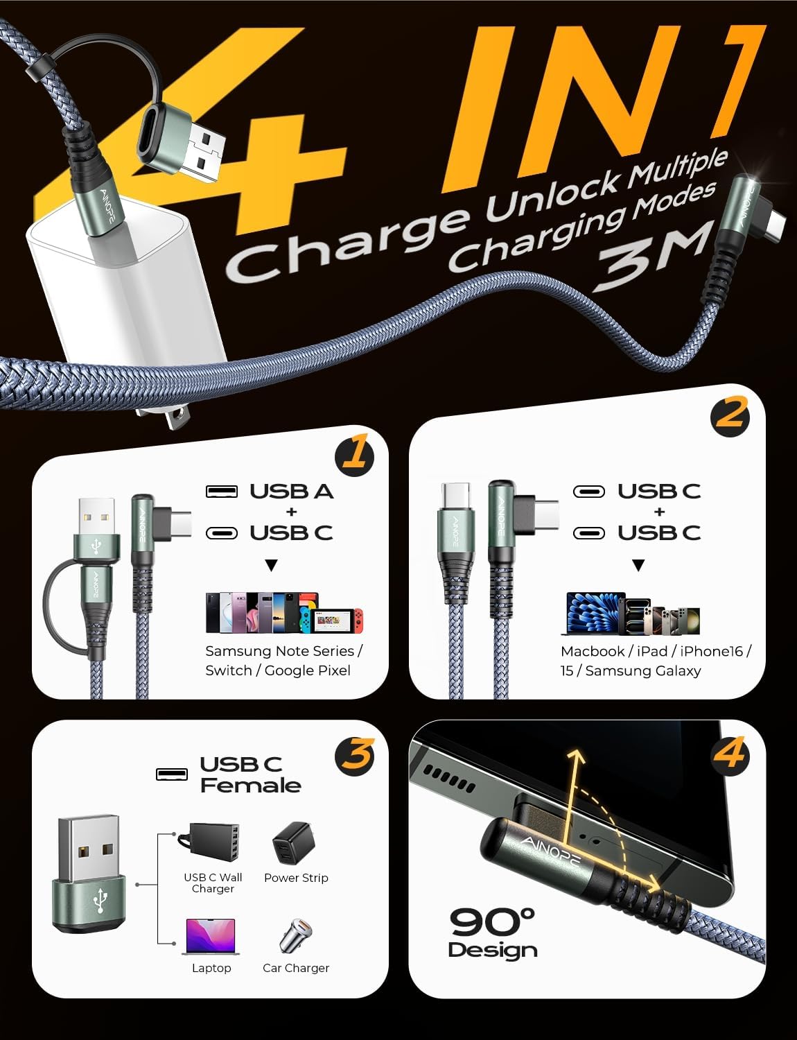 AINOPE 100W Long USB C Cable Multi 4 in 1 Charging Cable Fast Charging C Type Charger Fast Charge USB to USB C Cable,Right Angle USB C USB to C Fit iPhone 16 15 Pro Max iPad Samsung 10FT Grey