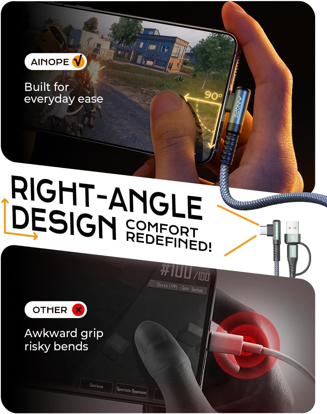 【COMFORTABLE GRIP】 The most comfortable grip is provided by the ergonomic 90°, “L” shaped C-type charger, which avoids “gamer’s thumb” (De Quervain’s tenosynovitis) and makes gaming more comfortable, while the super fast charger C-type, it is a magnificent choice for gamers and video enthusiasts. At the same time, it effectively avoids the bending of the end of the cable which leads to breakage and extends the life of the C-type fast charging cable