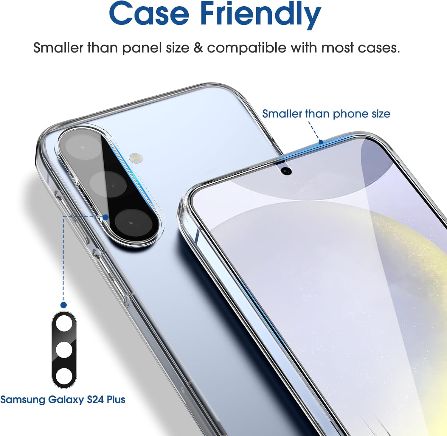 【2+2 Pack】 2* Samsung Galaxy S24 Plus 6.7″ Screen Protectors, 2* Camera Lens Protectors, with 2 auto alignment tool kit (screen protectors come pre-installed in the auto alignment tool) and cleaning kits. Everything you need for a perfect installation!