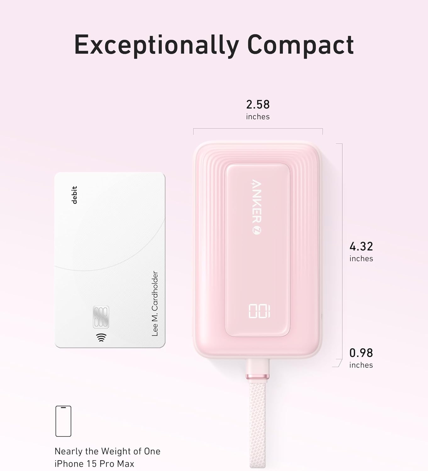 I recently got the Anker Zolo Portable Charger, and I couldn’t be happier with my purchase! I’ve been a fan of Anker products for the past few years, and this power bank definitely lives up to the brand’s reputation for quality and reliability.One of my favorite features is the built-in USB-C cable. It eliminates the need to carry an extra cord and has a secure loop design that makes it easy to attach to my bag or hold comfortably in my hand. It’s such a practical touch!The 30W power output ensures that my devices charge quickly, whether I’m at home or on the go. The compact size makes it perfect for travel, and the battery capacity is enough to keep my devices powered throughout the day.Overall, I highly recommend the Anker Zolo Portable Charger for anyone looking for a reliable and convenient power bank. It combines functionality with a thoughtful design, making it a must-have for anyone who’s always on the move!