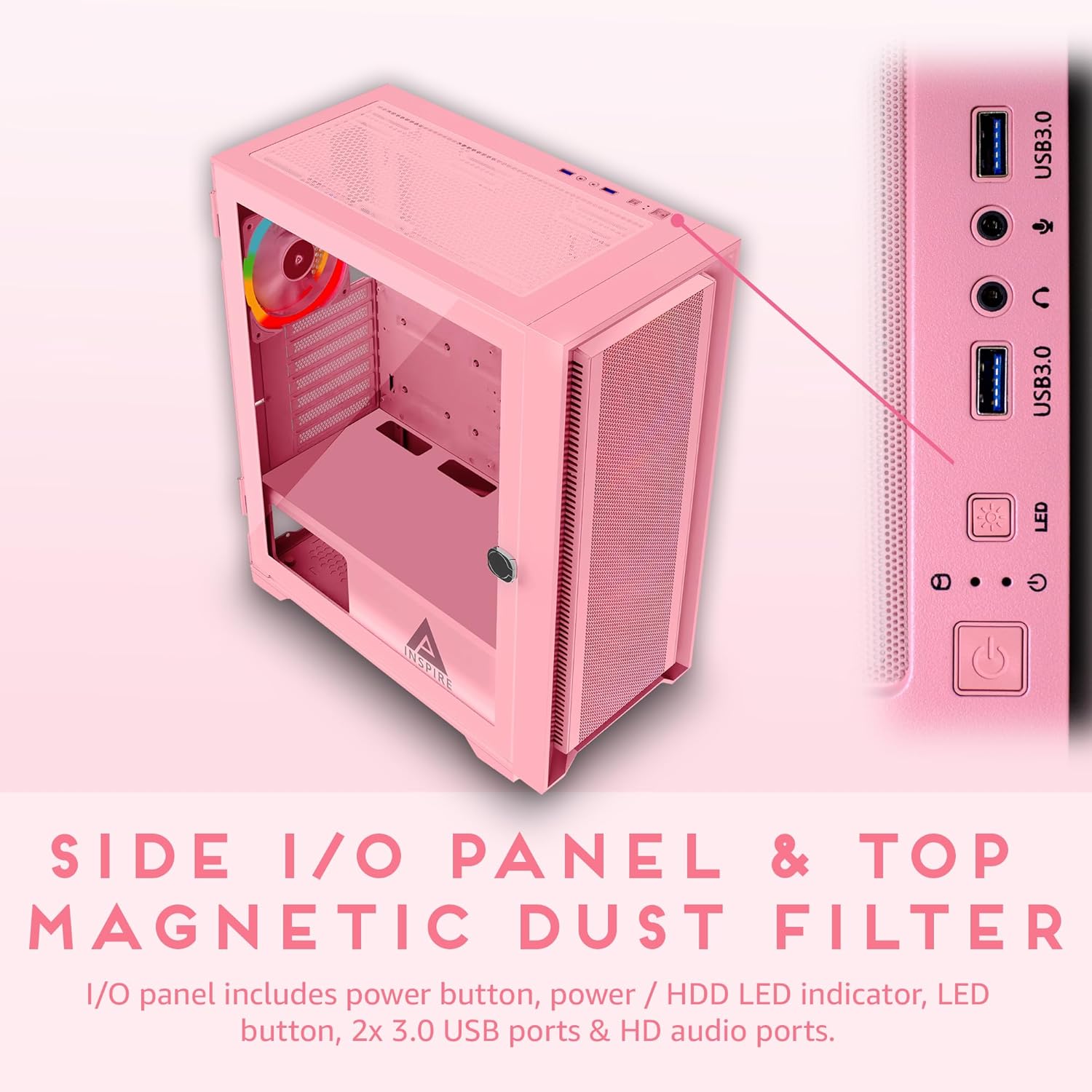 12 reviews for Apevia Inspire-PK Inspire Mid Tower ATX Gaming PC Case w/ 4X 120mm ARGB Fans, 366 RGB Light Modes, 1x Metal Mesh Airflow Front Panel, 1x Door Swivel Style Magnetic Glass Side Panel, 2X USB3.0, Pink