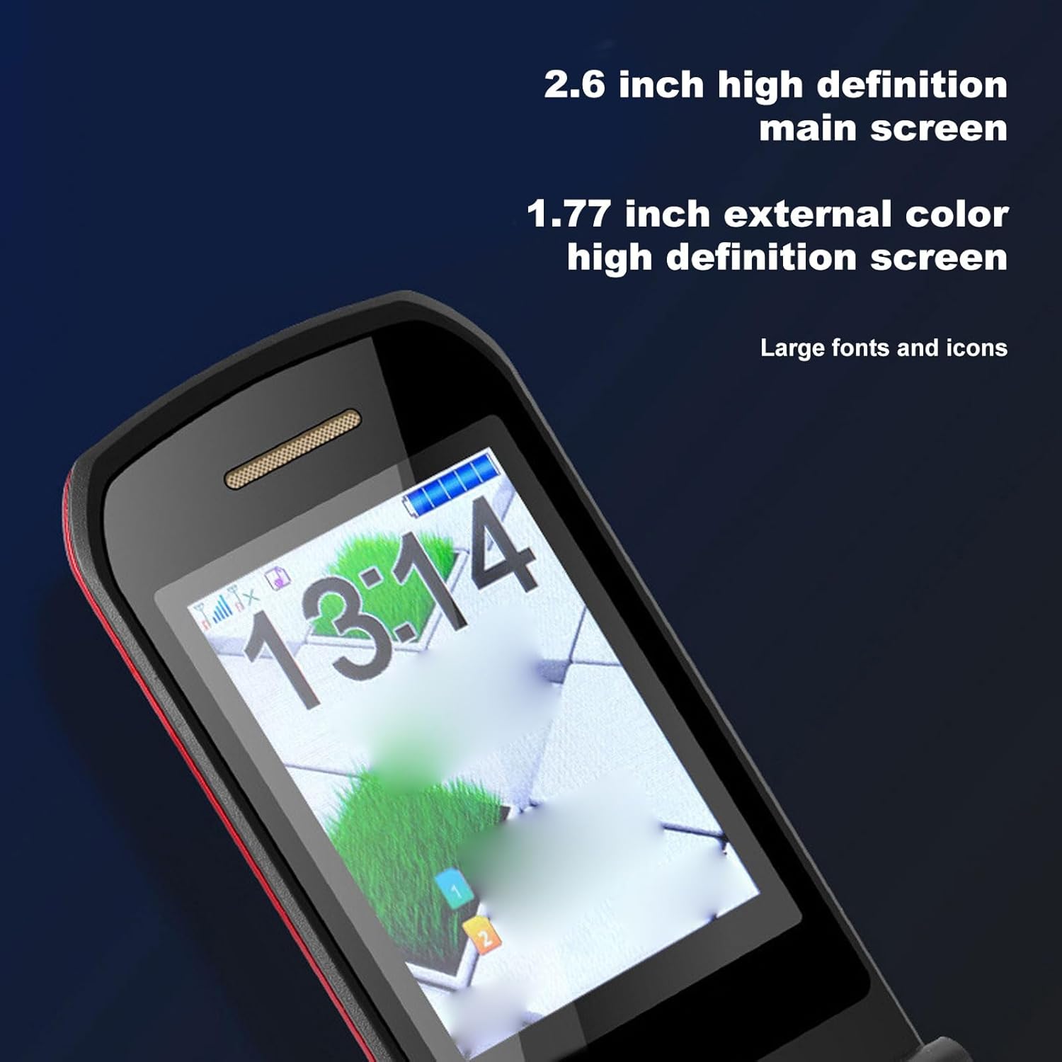 Dual Screens: 2.6 inch high definition main screen plus a 1.77 inch external color high definition screen. Large fonts and icons for convenient viewing.