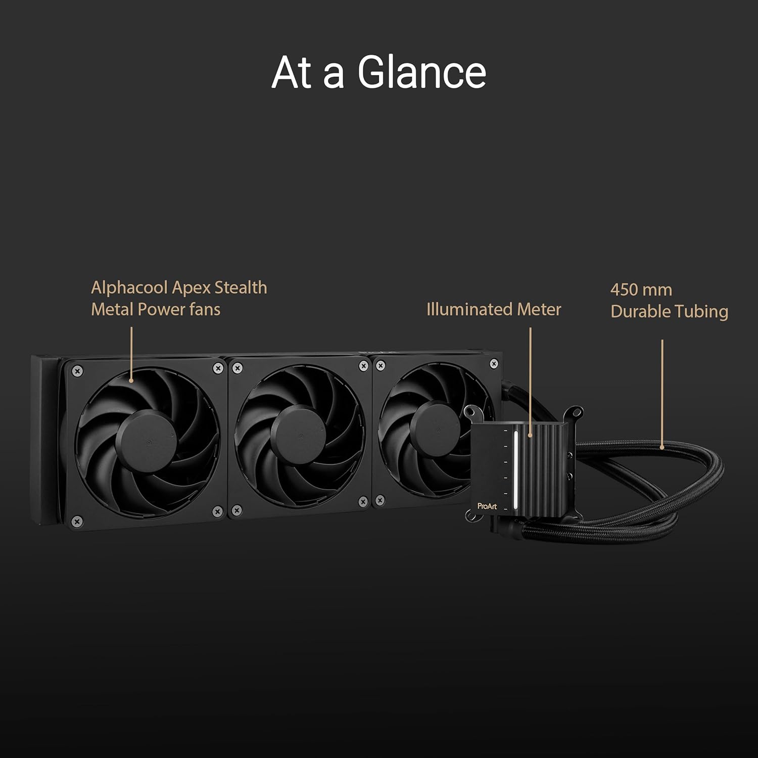 ASUS ProArt LC 360 all-in-one AIO CPU liquid cooler AMD AM4 AM5 & Intel LGA 1700, 1200, 115X support, with illuminated system status meter and three matte black Alphacool Apex Stealth Metal Power fans