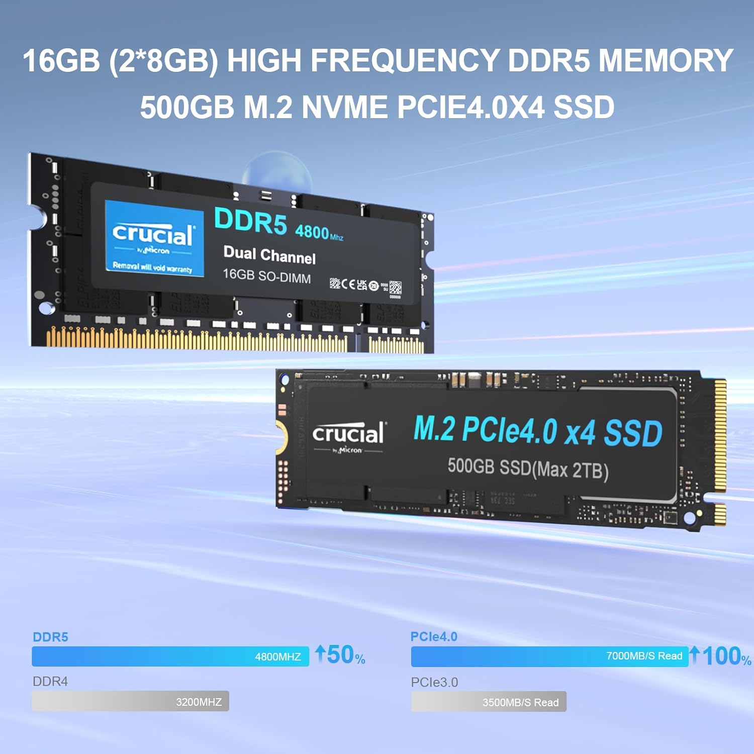 16GB DDR5 & 500GB PCIe4.0 SSD: EQR6 mini pc comes with 16GB DDR5-4800MHz RAM (8GB * 2, dual-channel, expandable up to 64GB) and 500GB M.2 2280 PCIe4.0x4 SSD (two SSD slots, max 4TB * 2, speed up to 7000MB/S, 2 times faster than PCIe 3.0). Large capacity helps to save more large programs in the computer and brings smoother operation of multi-tasking. High-speed SSD enables quicker load time of large files and high resolution content