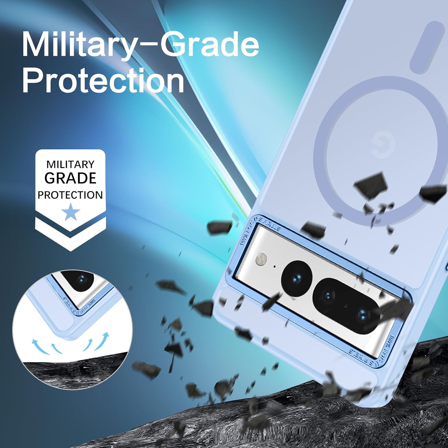 ♛【Compatible with MagSafe Accessories】 This Pixel 7 Pro Case, with a built-in magnetic ring that aligns perfectly with MagSafe chargers and other Qi-certified chargers, offers a strong attach experience and faster wireless charging. This Google Pixel 7 Pro Case can be firmly attached to all MagSafe accessories like MagSafe charger, wallet, battery pack, car mount. However, it can’t stick to metal surfaces like fridges, steel, etc.