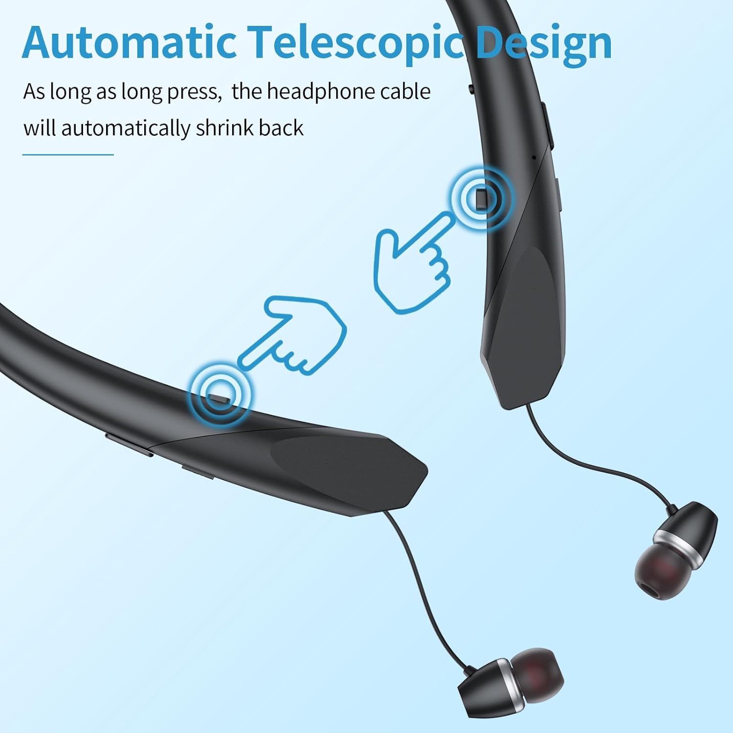Bluetooth Headset, 2024 Upgraded Wireless Neckband Bluetooth Headphones – Retractable Earbuds, Long Playtime, Noise Cancelling Stereo Earphones with Mic for Sports, Office, and Travel (BLACK)