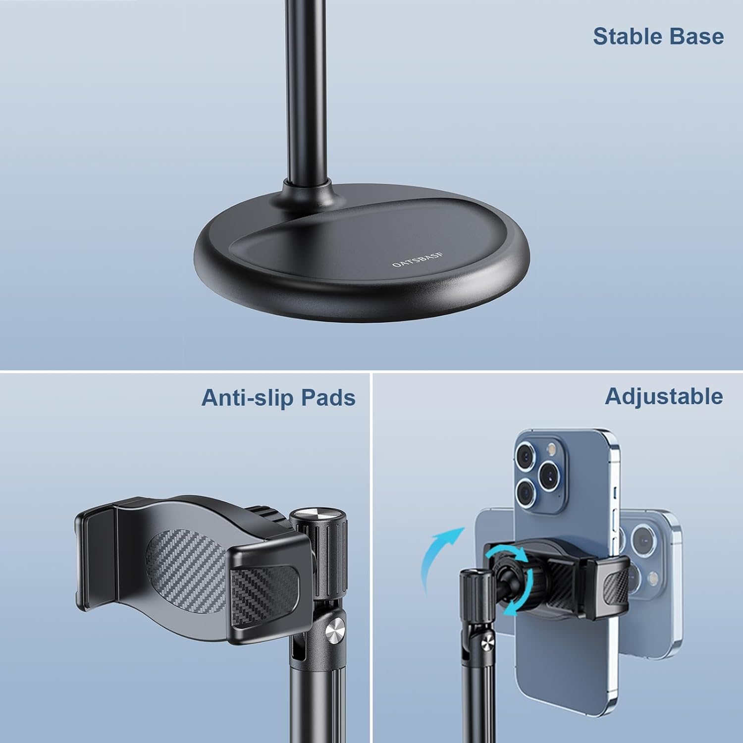 Elaborate Design: The weighted base, aluminum alloy support rod, and clip bracket make this phone stand more stable and durable; At the same time, the anti slip pad not only protects your phone from scratches, but also prevents it from slipping easily
