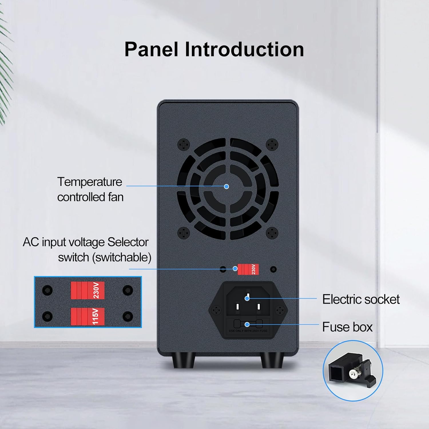 Multi-layer Security Protection: The variable dc power supply is designed with high quality and reliable circuitry. Configured with many safety protection settings.such as short-circuit protection, over-load protection, temperature-regulated fan, etc. to ensure performance and extend the lifespan.