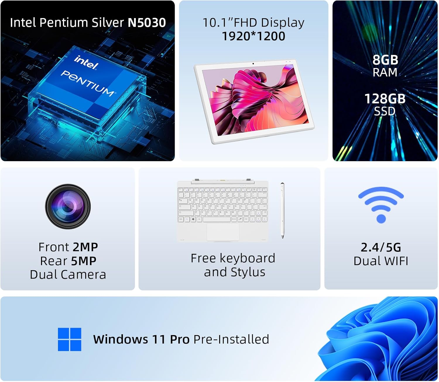 Detachable 2-in-1 Laptop with Touch Screen, 8GB DDR4 RAM/128GB SSD, 10.1″ Win 11 Tablet with Keyboard, Intel Pentium N5030 (Up 3.1GHz), 2.4G/5G WiFi, Bluetooth, USB3.0, Dual Camera