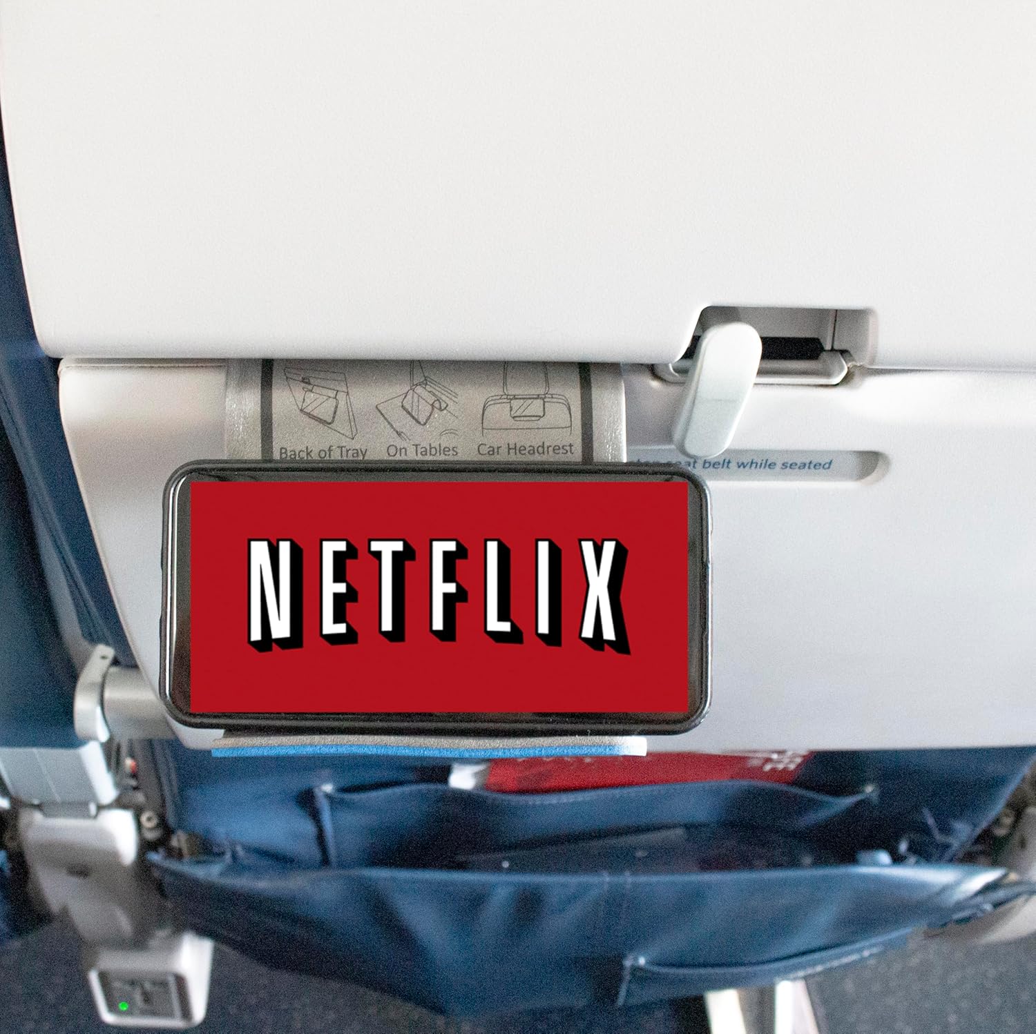 This has been a good product for holding up our phones and ipads on other surfaces, but the image showing it fitting within the tray table doesn’t seem appropriate. We’ve tried several times and the material is too thick, but is a great stand and very flexible for setting up on other surfaces.