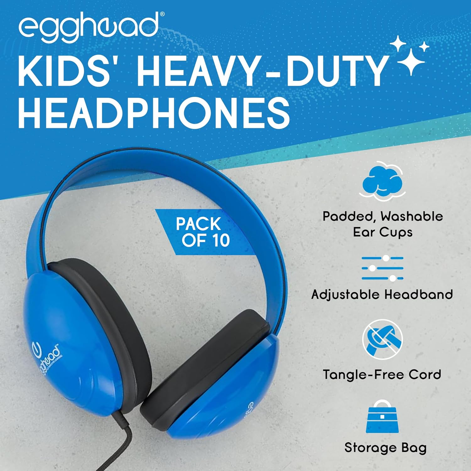 Egghead Heavy-Duty Kids’ Headphones with Padded Ear Cups and 6′ Cord, Adjustable Tangle-Free Plastic Classroom Headphones for Kids, Pack of 10, Blue