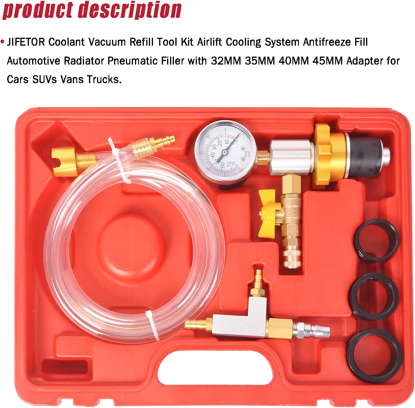 Shockproof gauge: -30~0 inHg/-76~0 cmHgEquip with rubber adapter (O.D. 32MM)Rotate the golden rotary knob, the adapter will expand slightly to achieve a sealing effectUsed to test leakage and replace coolant