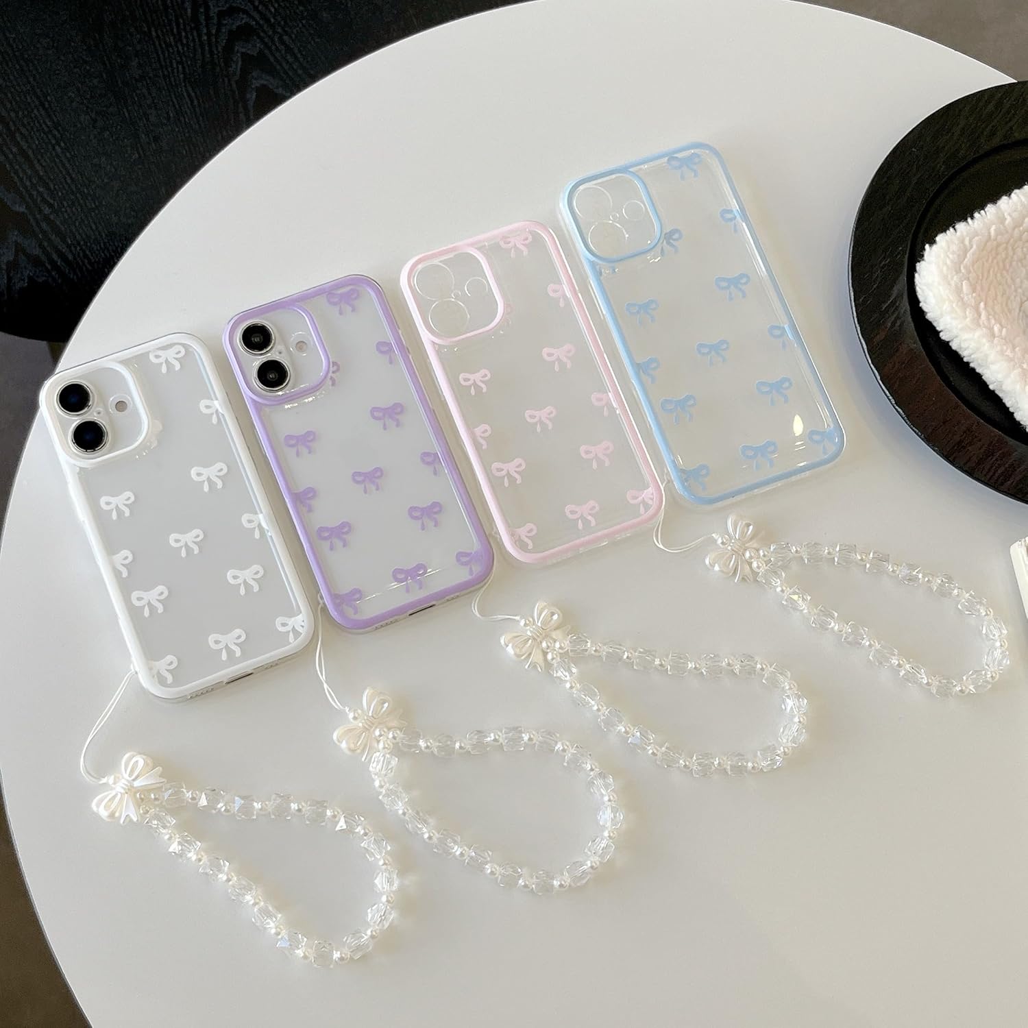 Delicate Bow knot Phone Case Phone Charm: The beautiful vivid ribbon bow pattern makes your phone look more attractive and eye catching; case for iPhone 16 Plus with adorable phone chain; this phone strap, adorned with bows, pearls, and transparent geometric beads, perfectly complements the phone case; it can also be used to decorate earphone case, handbag, wallet, and keychain, showcasing your unique flair and allure