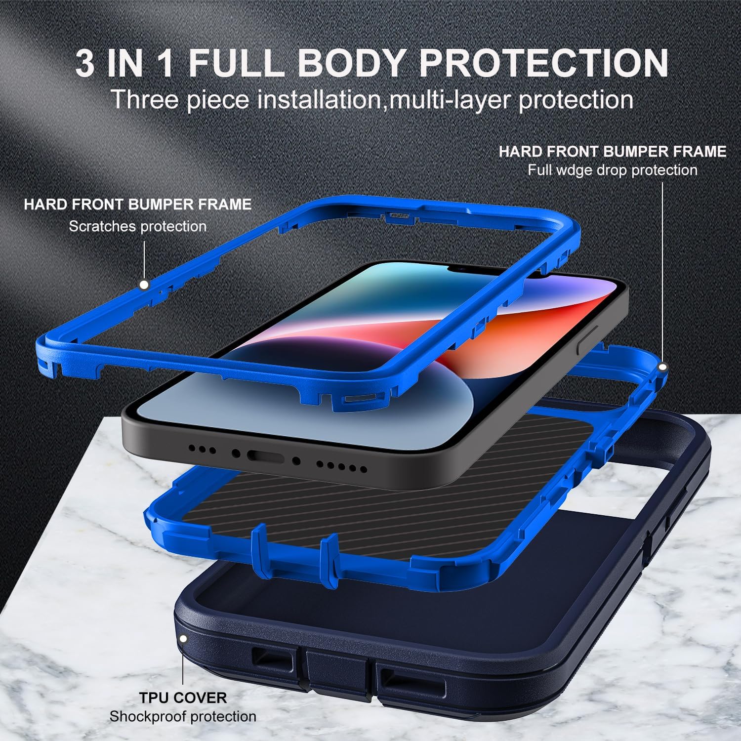 for iPhone 13 Case/iPhone 14 Case, Military Grade 3 in 1 Heavy Duty Shockproof/Drop Proof/Dust Proof Case with 2Pcs Tempered Glass Screen Protector (Navy Blue)