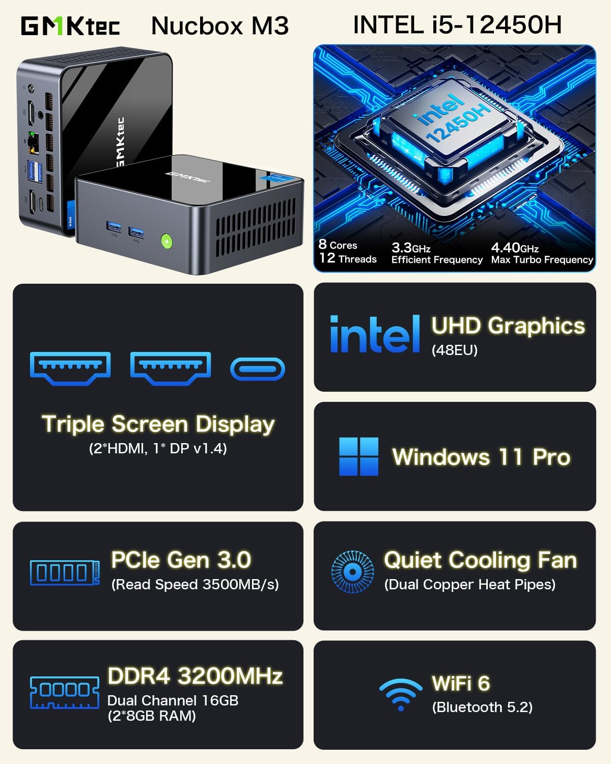 CPU 12th Generation Intel Core i5-12450H (3.30 to 4.40GHz Turbo Boost, 8C/12T, 12 MB L3 Cache) Graphics Intel UHD Graphics 1.20 GHz RAM 16GB (Dual Channel 2*8GB DDR4 3200 MT/s SO-DIMM*2) ROM 512GB PCIe 3.0 M.2 2280 SSD (Read: 3000MB/S & Write: 2500MB/S) OS Pre-installed Win 11 Pro (Compatible with Win10, Ubuntu, Linux) Wireless LAN WiFi 6(802.11ax), Bluetooth 5.2, Intel i226V Ethernet 2500Mbps RJ45 Video output 3 Display Output, Dual HDMI 2.0 (4K@60Hz) + Type-C DP Memory Expansion Dual SO-DIMM DDR4 3200 MHz Slots. Dual Channel MAX. 64GB Storage Expansion M.2 2280 SSD (Max. 2TB) / M.2 2242 SATA (Max. 2TB) Other Functions Wake ON Lan, Auto Power ON, Performance Settings lnterface 1 x Power Button; 1 x DC IN; 3 x USB 3.2 Ports; 1 x USB 2.0 Port; 2 x HDMI Ports; 1 x Type-C (DP/DATA); 1 x RJ45 2500Mbps; 1 x Audio Jack (HP&MIC) Power Adapter DC IN (5.5/2.5mm), 20V/5A 100W Operating Environment -10°C–45°C,30%–85% Humidity Storage Environment -20°C–60°C,10%–90% Humidity Cooling Method Air Cooling Fan Package Contents 1 x GMKtec Nucbox Black M3 Intel Core i5-12450H Mini PC, 1 x Power Adapter, 1 x VESA Mount with Screws, 1 x HDMI Cable, 1 x User Manual