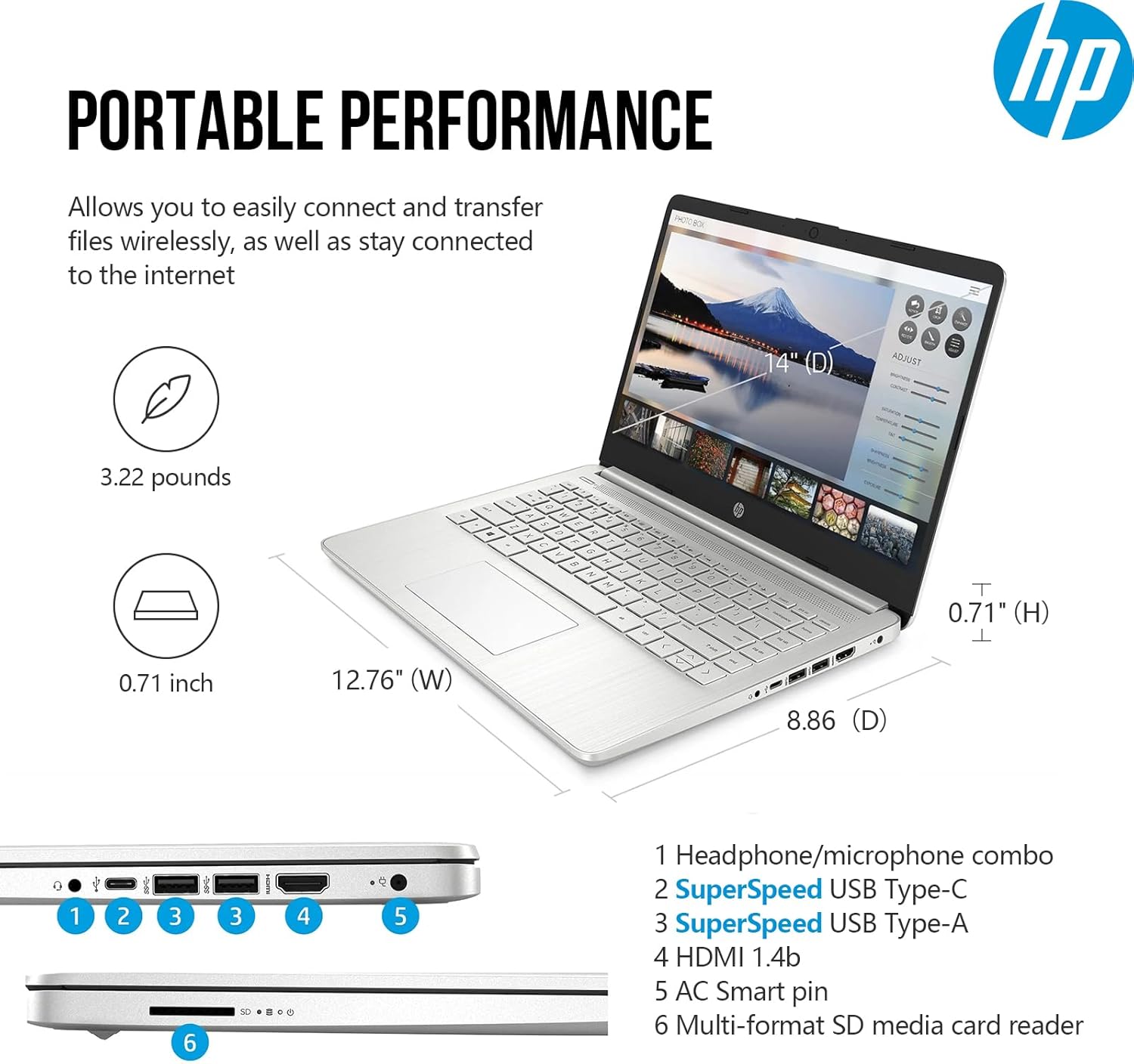 IMMERSIVE DISPLAY, PORTABLE DESIGN: With a 14-inch Full HD (1920 x 1080), micro-edge IPS display, the HP laptop computer delivers incomparable performance that fits your lifestyle and budget. Easy on eye and staying focused, enjoy crystal-clear visuals with impeccable detail and lifelike colors, perfect for editing, gaming, school or entertainment. With a slim and sleek design and only 3.22 lbs, easily take this ultra-thin and light HP 14 inch laptop amd from room to room or on the go