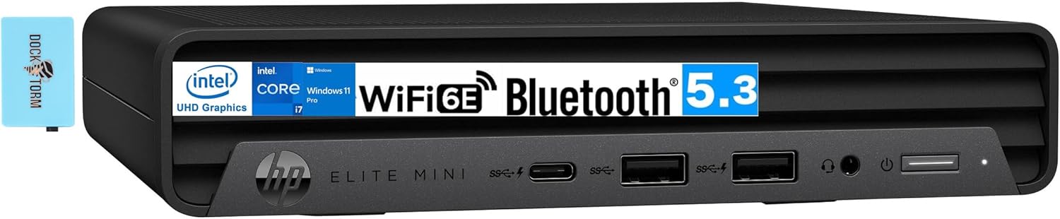 Configuration We offer all of the following configuration, if you have difficulties to find the right listing, please check other Listings on our Store Model Name HP Elite Mini 800 G9 Form/Color Mini PC/Black Color RAM Customizable RAM: 16GB, 32GB, 64GB DDR5 SO-DIMM Hard Drive Customizable Storage: 128 PCIe SSD, 256 PCIe SSD, 512GB PCIe SSD, 1TB PCIe SSD, 2TB PCIe SSD, 4TB PCIe SSD, 8TB PCIe SSD (Solid State Drive), 2x512GB PCIe SSD (1TB), 2x1TB PCIe SSD (2TB), 2x2TB PCIe SSD (4TB), 2x1TB PCIe SSD (2TB), 2x4TB PCIe SSD (8TB), 2x8TB PCIe SSD (Solid State Drive) (16TB available storage) Operating System Window 10 Professional (Win 10 Pro-64), Window 11 Professional (Win 11 Pro-64) Processor Intel Core i7-12700T 1.40GHz Processor (12th Gen, upto 4.7 GHz, 25MB Cache, 12-Cores, 20-Threads, 8 Performance Cores) Graphics Card Intel UHD 770 Integrated Graphics Connectivity Wi-Fi 6E AX211, Bluetooth 5.3, Ethernet LAN (RJ-45) Ports/Slots 4 x USB 3.2 Type-A, 1 x USB 3.2 Type-C, 1 x HDMI, 2 x Display Port (DP), 1 x Ethernet LAN (RJ-45), No Optical Drive, Headphone/Microphone Combo Jack Other Features 90W Power Supply, Black, USB Keyboard, USB Mouse Product Dimensions (WxLxH) 6.97 IN x 6.89 IN x 1.35 IN Weight 2.5 lb Includes Authorized Dockztorm Portable USB Hub (Special Edition Portable Dockztorm Data Hub; Super Speedy Data Sync Rate upto 5Gbps)