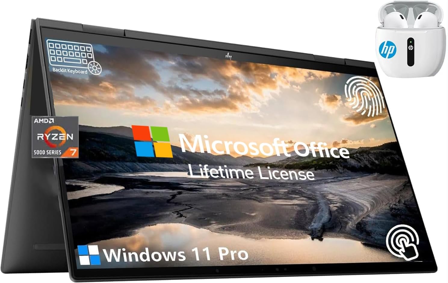 HP Envy x360 2-in-1 Convertible Business Laptop, 15.6 Inch FHD Touchscreen, AMD Ryzen 7 5700U, Windows 11 Pro, 64GB RAM, 2TB SSD, Backlit Keyboard, Fingerprint Reader, WiFi 6, HDMI, Black, PCM