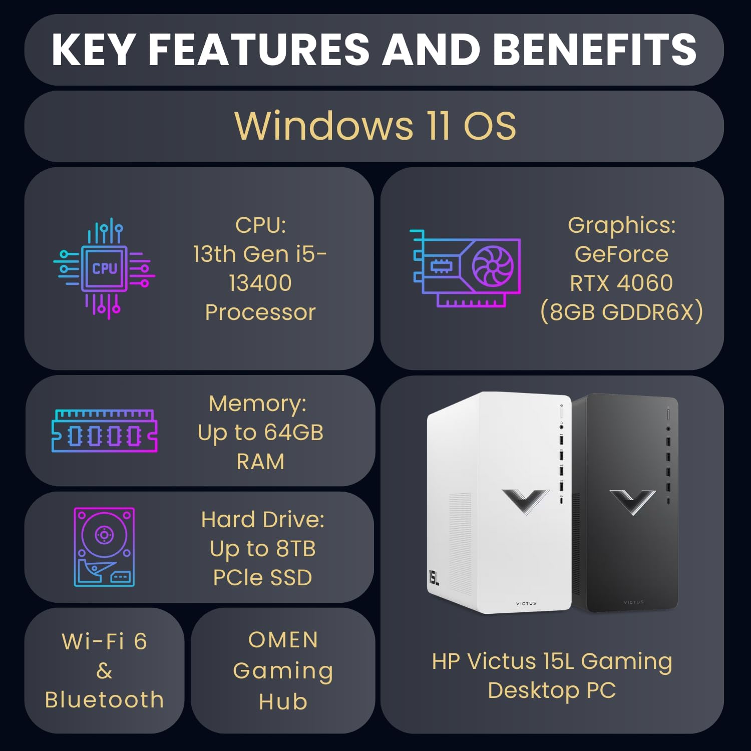 2 reviews for HP Victus 15L i5 RTX 4060 Ultimate Gaming Desktop, Intel i5-13400 (Beats i7-1255U), GeForce RTX 4060, 64GB RAM, 2TB SSD, RJ-45, DisplayPort, Wi-Fi 6, Wired KB&Mouse, Windows 11 Home, White