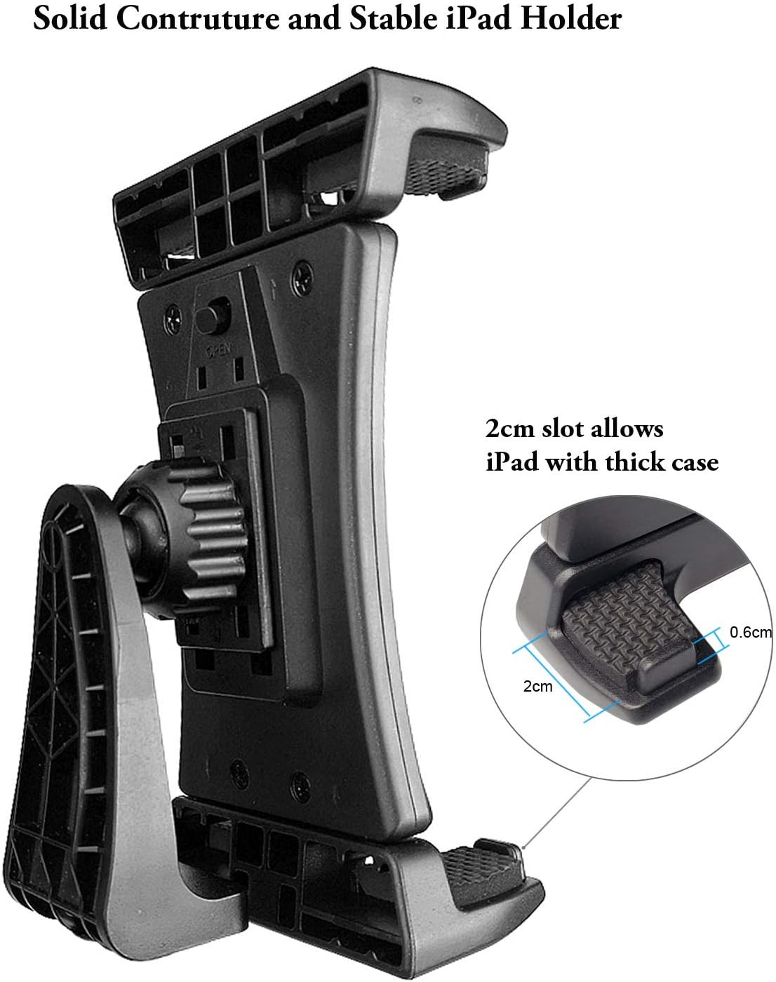 Best Design Mount – an adjustable loading button in upper, press to open the clip upward. double spring-locked system in bottom, provide the strong clamping force, will secure your device steadily in place allows you fast install and remove your tablet