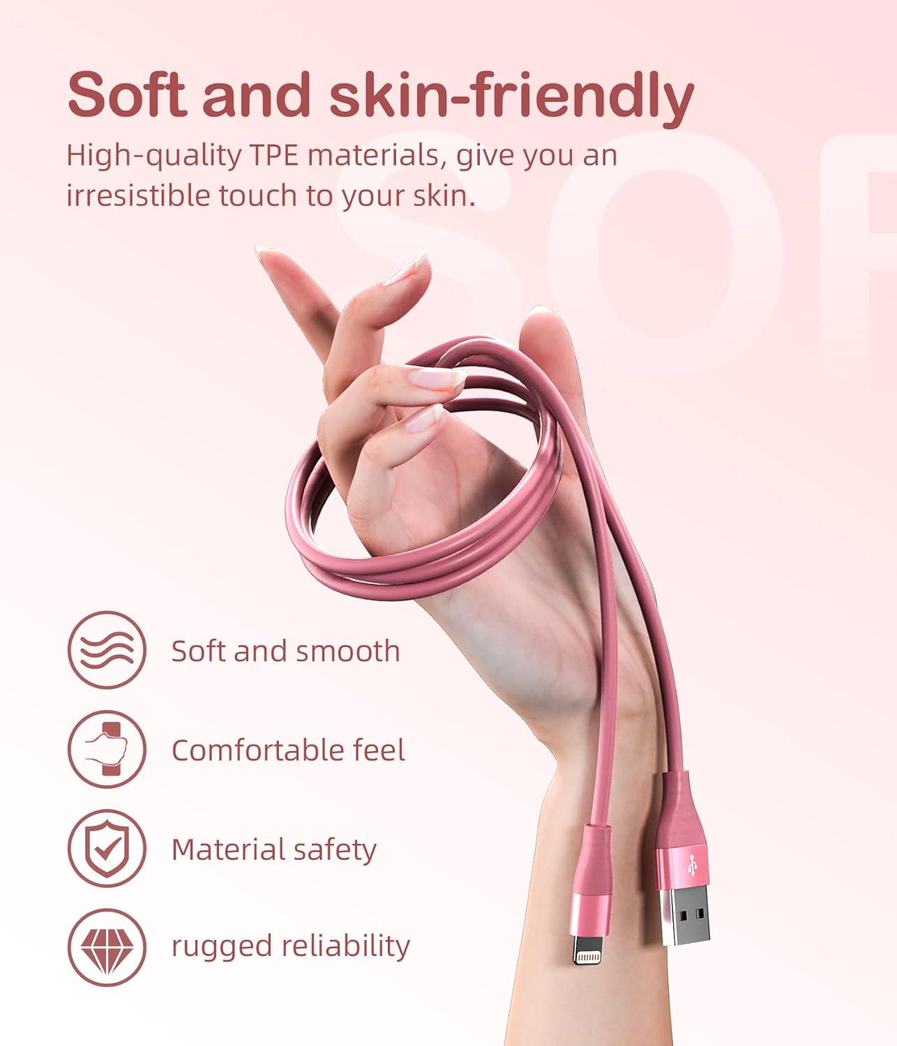 The lightning cables are designed with fashionable colors. Made of soft and smooth TPE colorful material, not only more durable and wear-resistant, but also brings you a wonderful visual experience and adds color to your life.