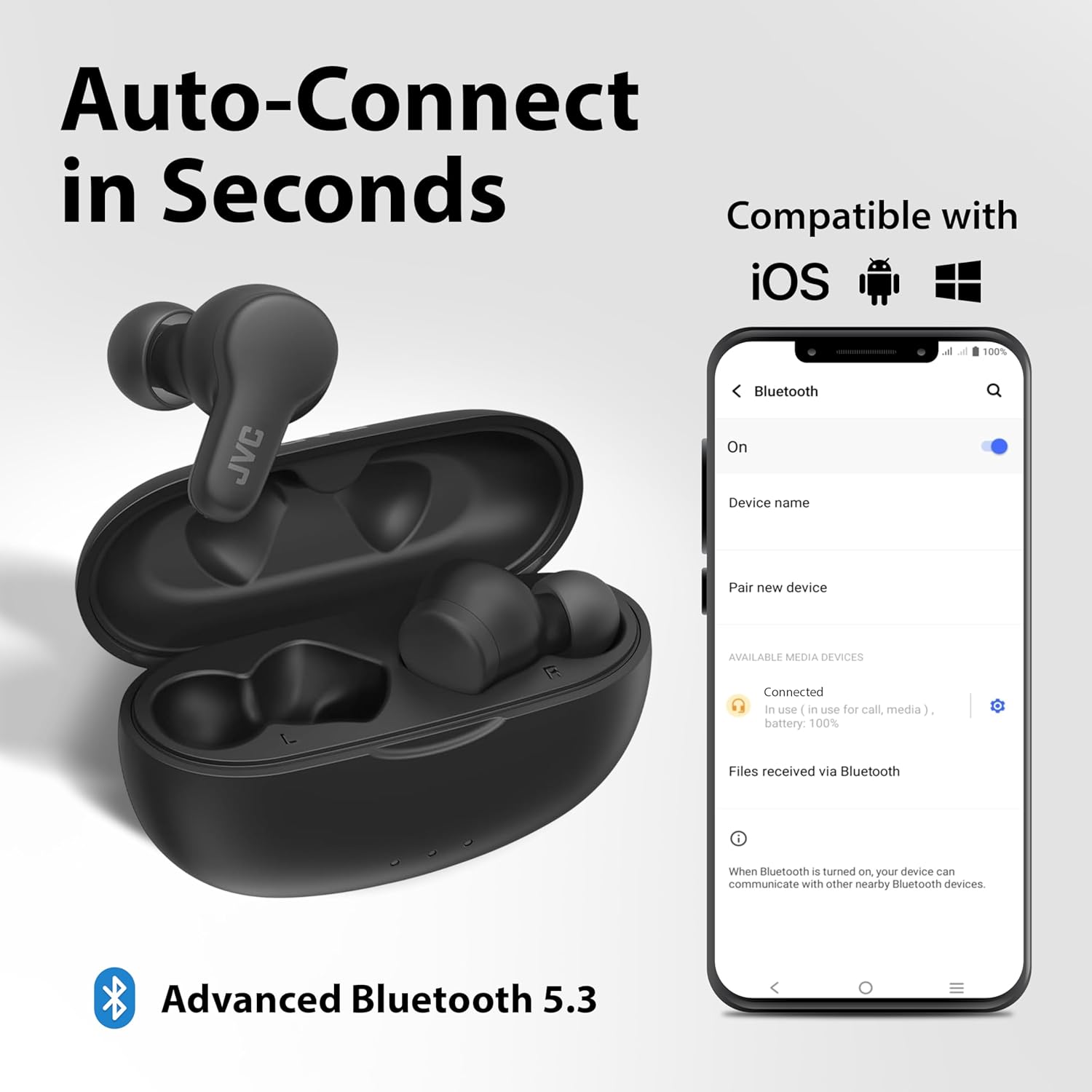 JVC Gumy True Wireless Earbuds Headphones – Bluetooth 5.3 Ear Buds with Compact Charging Case – Water Resistant – 24 Hour Playback – XS/S/M/L Earpieces Mic for Calls – iOS/Android/PC