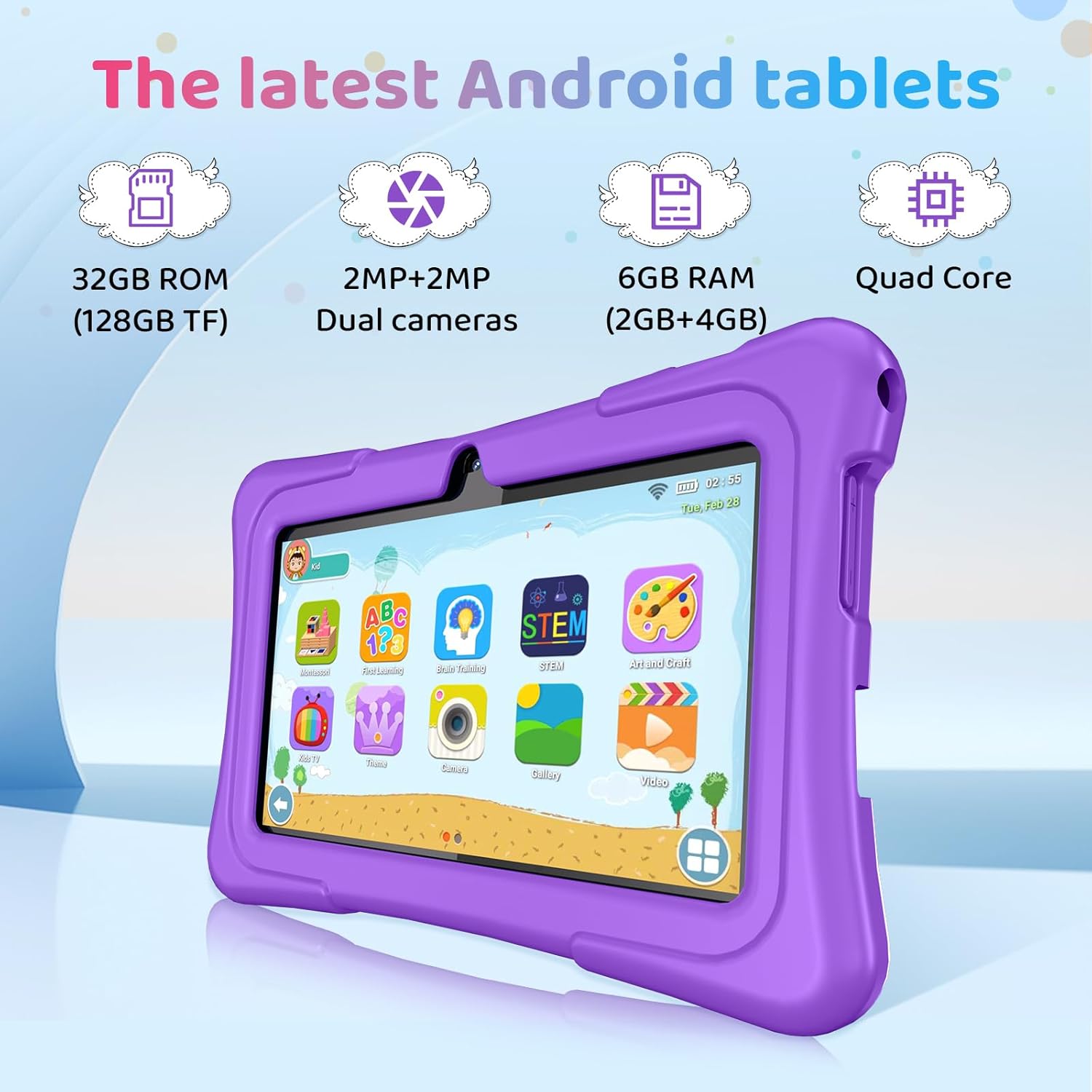 Kids Tablet, 7 inch Android Tablet for Kids, 6GB RAM 32GB ROM Quad-Core Toddler Tablet with Shockproof Case, Bluetooth, WiFi, Parental Control, 2MP+2MP Dual Camera, GPS, Games (Purple)