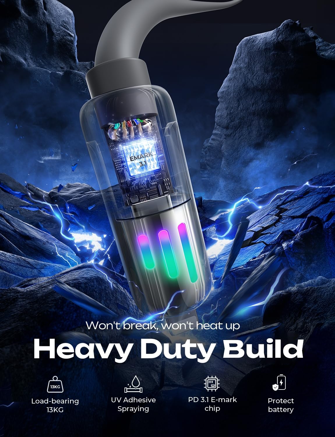 [PD3.1 Emark Safe Chip & RGB light] The USB C to USB C Cable EMARK3.1 chip not only enables 240W fast charging but also maximizes device safety, ensuring 24-hour constant temperature charging. It automatically stops charging once the device is fully charged, preventing overcharging and battery damage. And RGB lights on both ports will keep changing colours when charging. It is a soft light, not flashing eyes, full of gaming atmosphere.