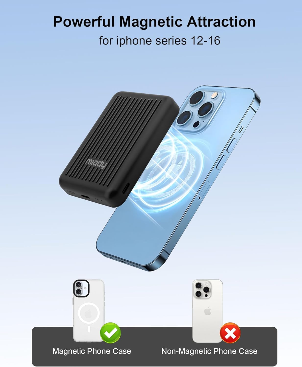 Miady MagSafe-Compatible Portable Charger, 5000mAh Wireless Portable Charger, Magnetic Power Bank for iphone16/15/14/13/12, Battery Pack with 12W USB-C Charging
