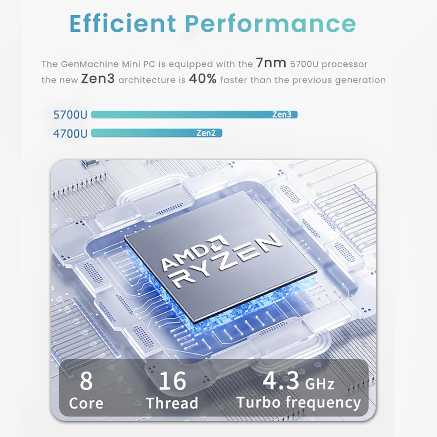 Genmachine Mini PC with AMD Ryzen 7 5700U – Unleash Power in a Compact Design Elevate your gaming, office, and design experience with the Genmachine Mini PC, powered by the AMD Ryzen 7 5700U processor. Boasting 8 cores and 16 threads, this powerhouse reaches speeds of up to 4.3GHz, ensuring smooth performance for multitasking, gaming, and professional software. Perfect for Any Use Whether you’re a gamer, content creator, or business professional, the Genmachine Mini PC is your reliable companion for gaming, office work, and graphic design. Its compact design makes it easy to integrate into any setup without clutter.