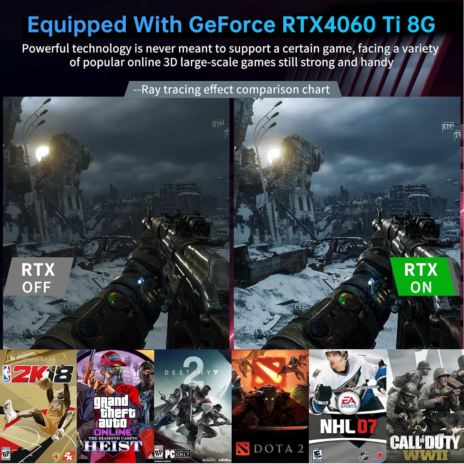 [HD Four-Display] Mini PC equipped with RTX4060Ti 8G GDDR6 discrete graphics card, supporting ray tracing and AI cores. easy connect 4 monitors, 2 x HDMI 2.0 and 2 x DP1.4 ports(All Support 7680 x 4320 display), It can provide you with a first-class TV experience and realistic picture quality, for your visual home entertainment, streaming video, web browsing, work design and 3D games create a very smooth experience.