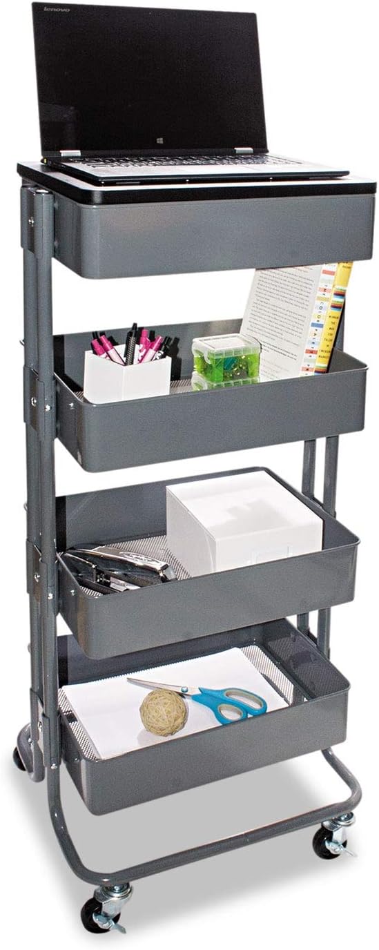 Heavy-duty, metal construction with a removable MDF top tray. Center two baskets are adjustable in height. Can be configured with four bins as a standing laptop station, three bins for deskside storage, or two bins for underdesk use. Rolls smoothly on four casters, two locking. Color: Gray; Capacity (Weight): 50 lbs.; Caster/Glide/Wheel: Four Casters (2 Locking); Material(s): MDF; Metal.