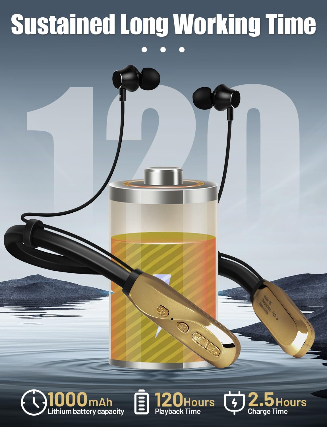 Neckband Bluetooth Headphones, 120H Long Playtime Wireless Stereo Neckband Earbuds with Microphone, Waterproof Around The Neck Headphones in Ear Headset for Sports/Workout/Office (Gold)