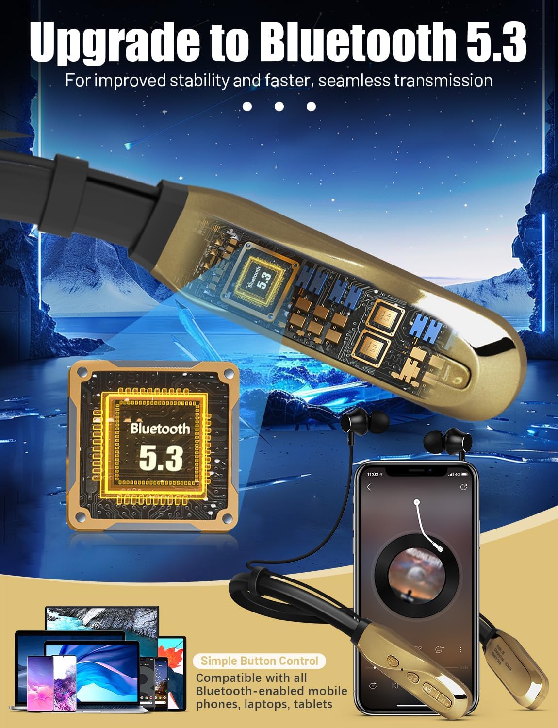 LATEST BLUETOOTH V5.3 & ADVANCED COMPATIBILITY: Around the neck headphones bluetooth 5.3 provides fast and stable transmission without interruptions. Wireless headphones supports most bluetooth devices .It also supports Voice Assistant, just short press the power button 2 times to start “Siri” or Google Voice Assistant.