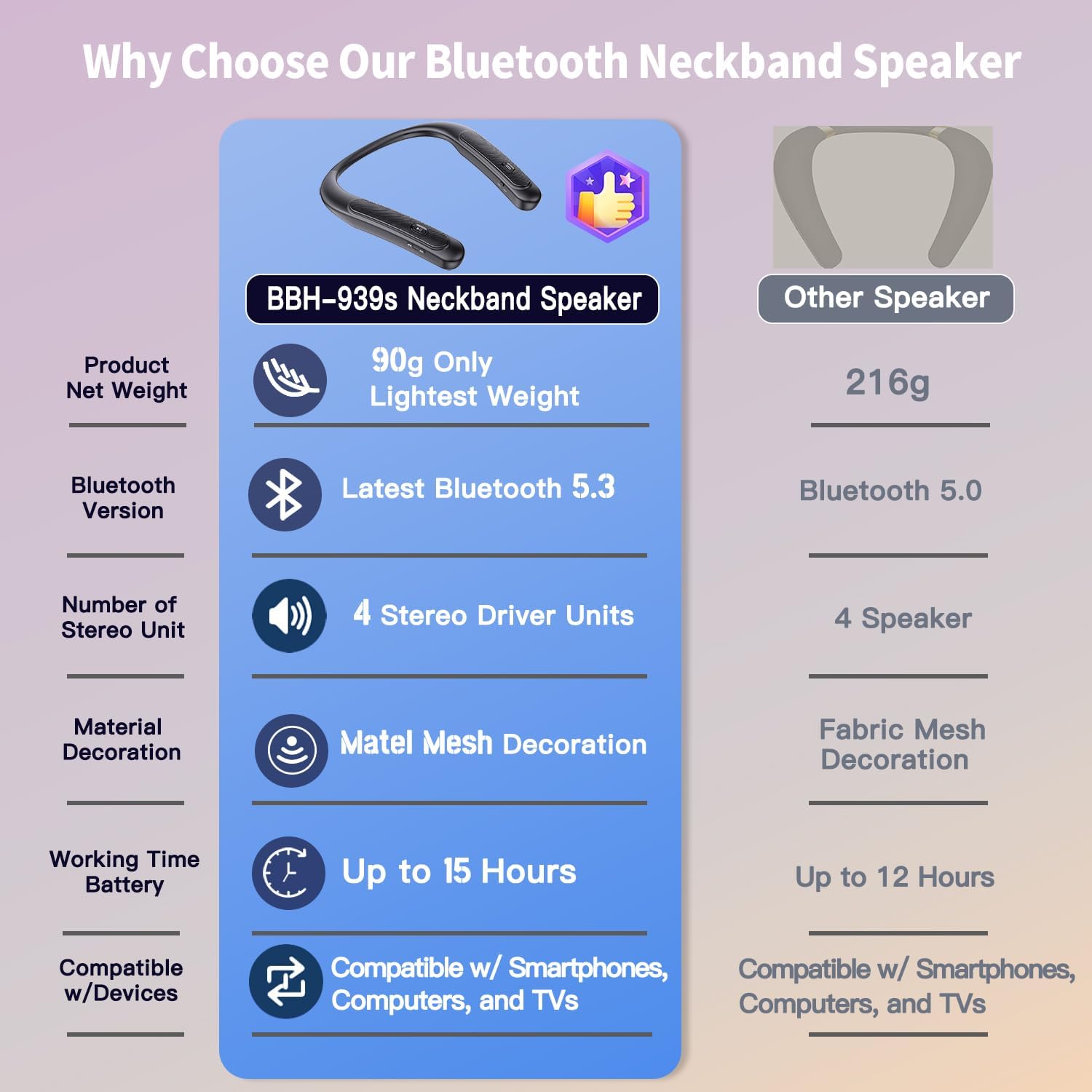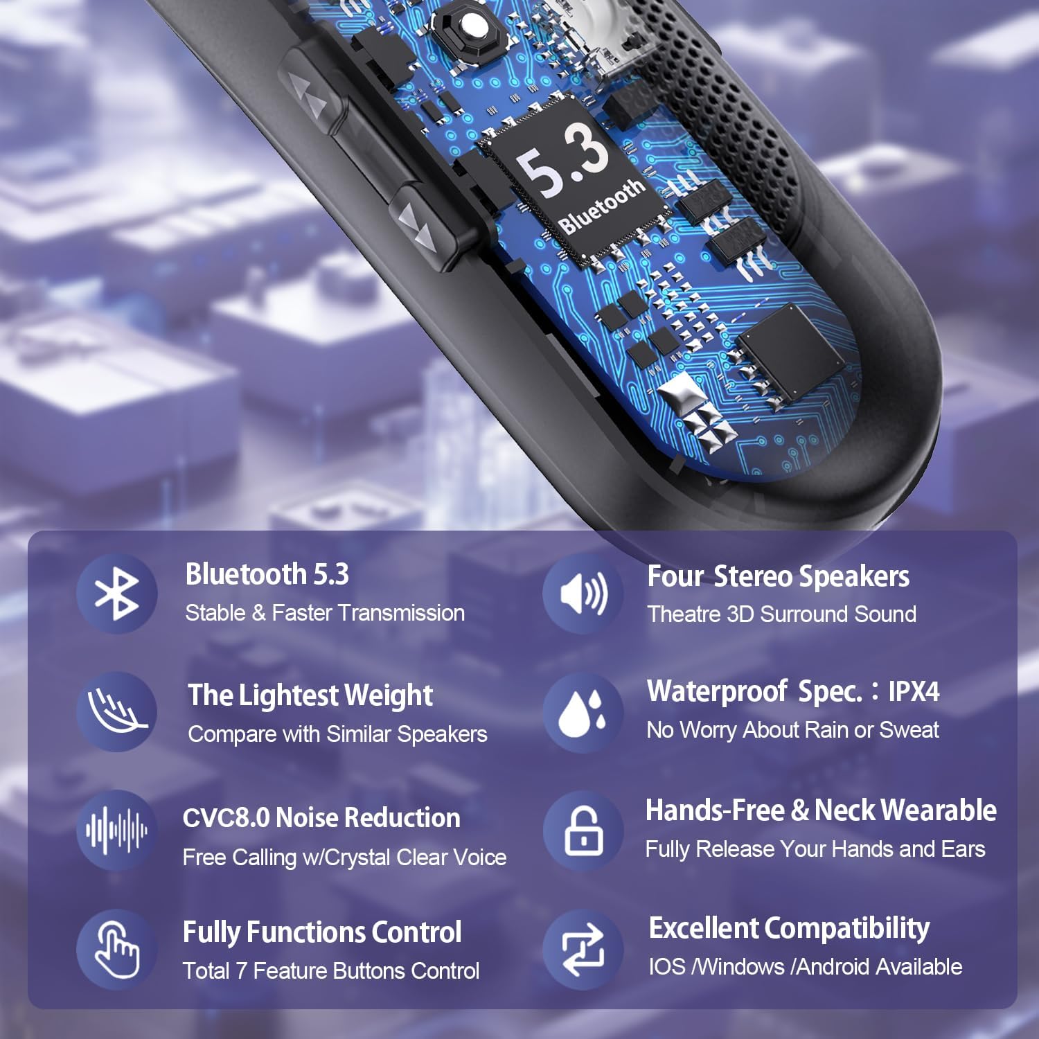 【Immersive 3D Surround Sound Experience】The lightest weight neck speaker featured with 4 strategically placed speaker units, it delivers immersive 360-degree surround sound, placing you at the center of the action with dimensional, lifelike sound. These strategically positioned speaker units create a concert-like ambiance wherever you go.