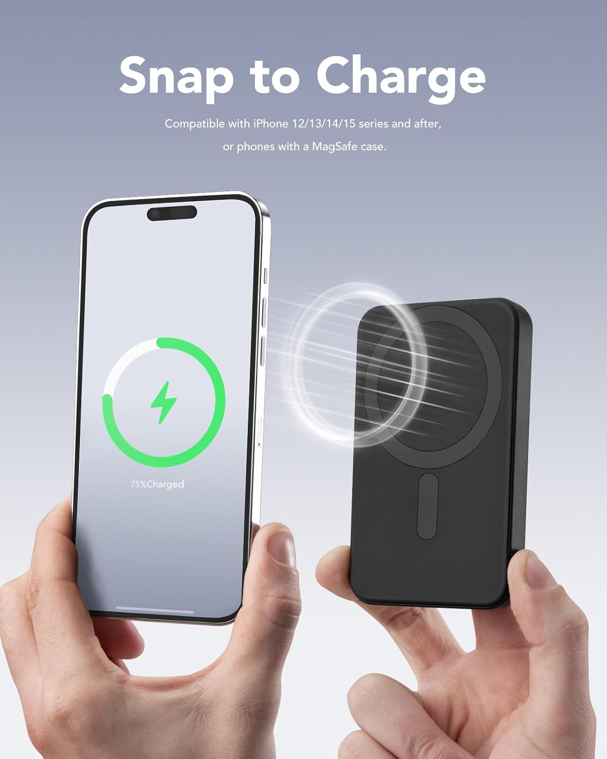 Charge by a Snap -The power bank is built-in strong magnets that 100% compatibly work with MagSafe. Charging your phone is only by a snap. The power bank will be perfectly aligned and firmly attached to your iPhone and make a reliable and efficiency wireless charging.