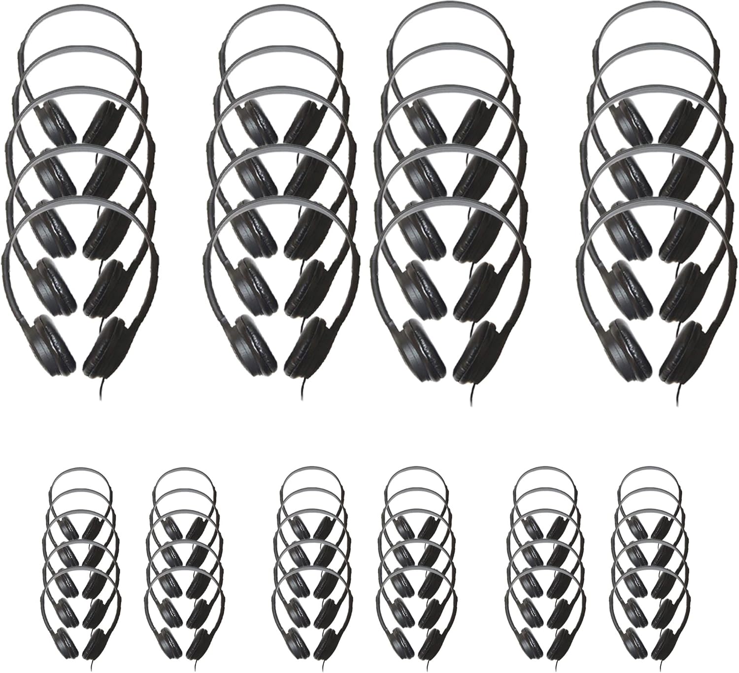BULK CLASSROOM HEADPHONES – Case packs of 10, 25, 50, 100, 200, or 500 low-cost stereo school headphones, individually packaged in a heat-sealed plastic bag