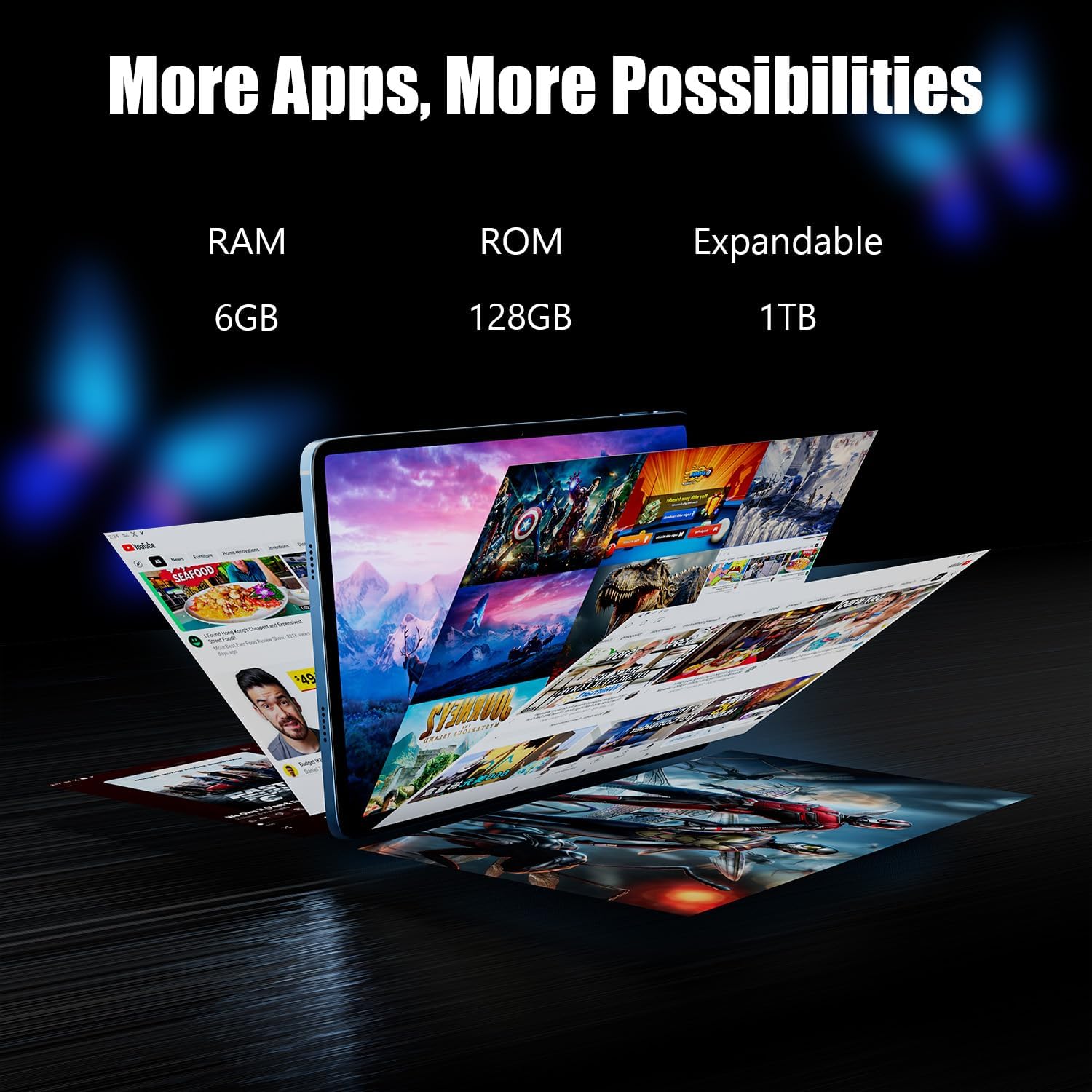 Unlimited Storage: Your World at Your Fingertips” Experience the freedom of massive storage space with our device featuring a built-in 128GB ROM and the flexibility of up to 1TB expandable memory.