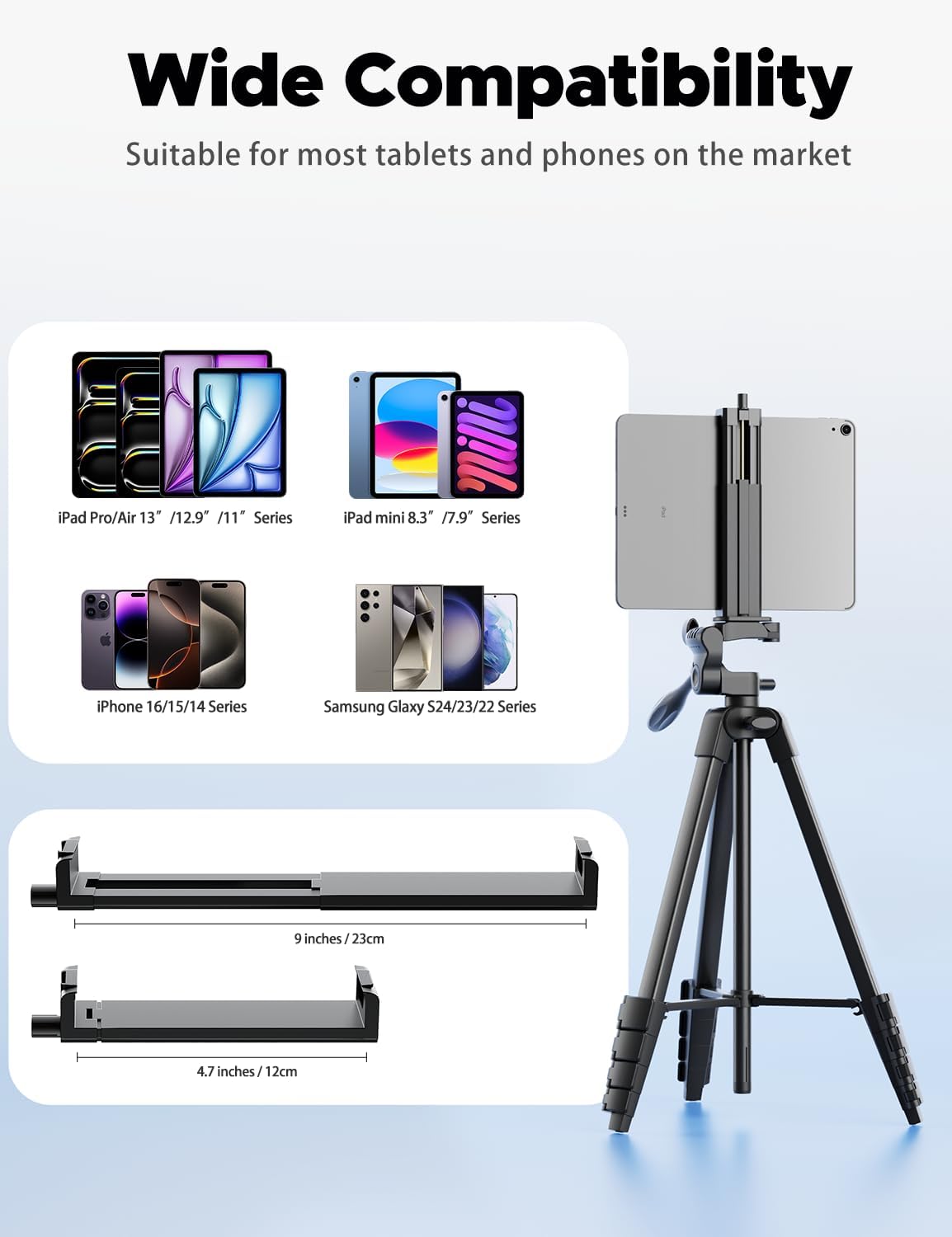 【Universal iPad Holder With Cold Shoe 】: The iPad Holder ‘s Width Can Be Adjusted From 4.7 to 9 inches. Compatible With: iPad Pro13“/12.9″/11″/9.7″, iPad Air/ iPhone 15 Pro Max/15 Pro/15/Galaxy Note. And It’s Equipped With Cold Shoes, Suitable For Flash Light, Microphone, Etc. Both Ends Of The Mount Stand Have Non-slipping Silica Gel Pads Which Prevent Your Devices From Scratching
