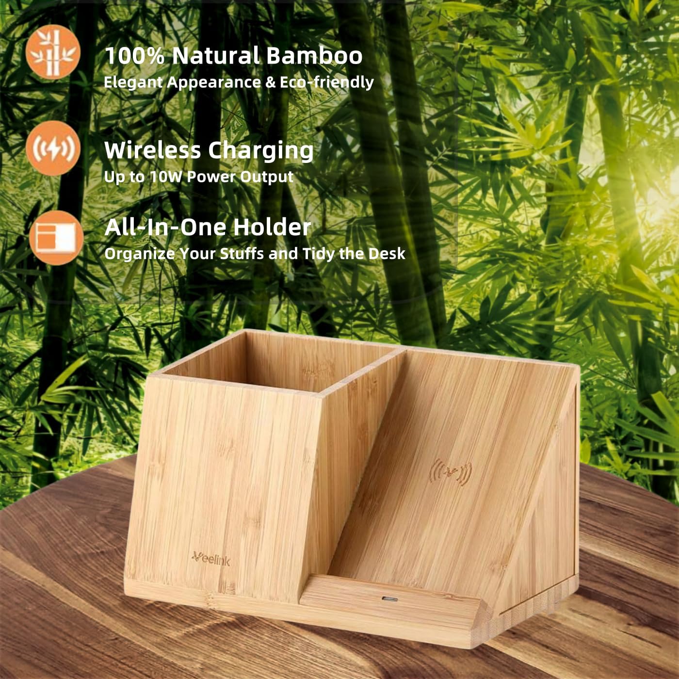 Veelink Bamboo Wireless Charger with Organizer Wood Wireless Charging Station for iPhone 16/15/14/13/12/11/Xs Pro MAX/XR/XS/X/SE, Compatible with Samsung S24/S23/S22/S21/S20 S & Note Series(Standard)