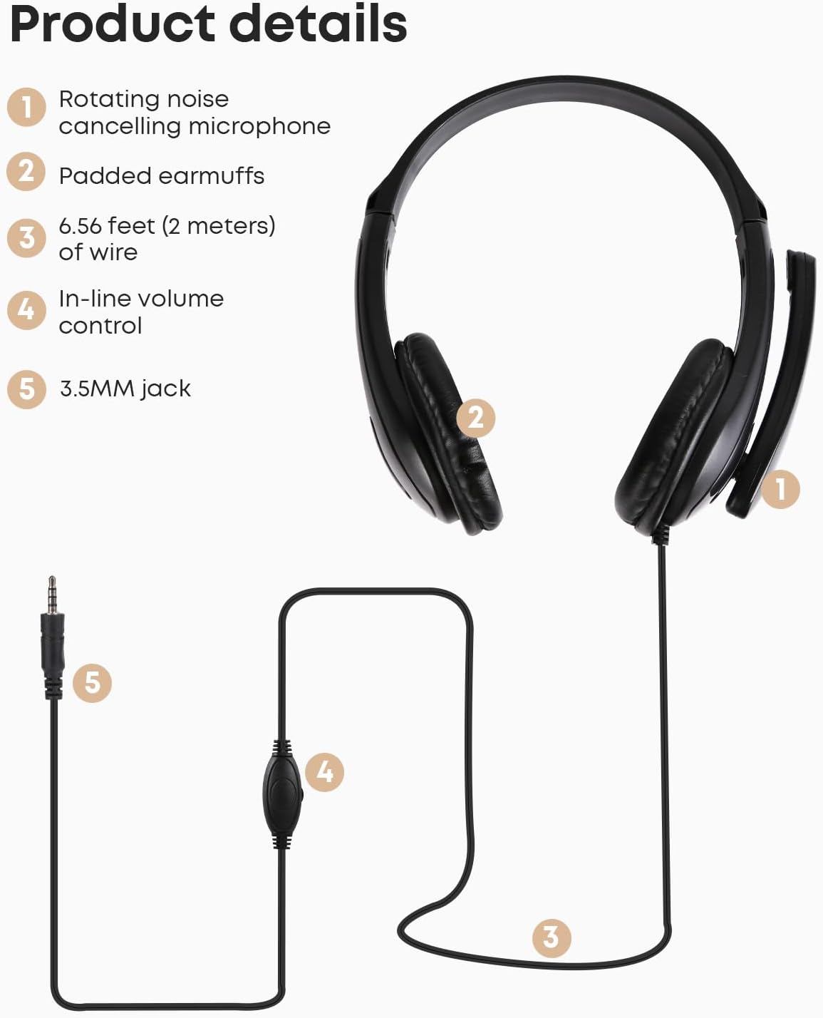 Wired Headphone for PC/Laptop – On-Ear Headphones with Mic, Adjustable Headband – 3.5mm Headphones for Computer/Cell Phones/Home/School (Black)
