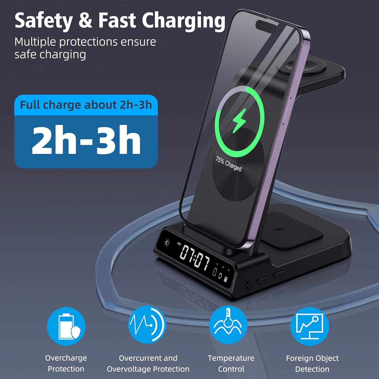 I received my wireless charging station, and it’s amazing! I love having all my devices charging together in one place without any cable mess. I highly recommend it! It also works as a clock, so you can display the time on it. This is one of the best purchases I’ve made on Amazon.