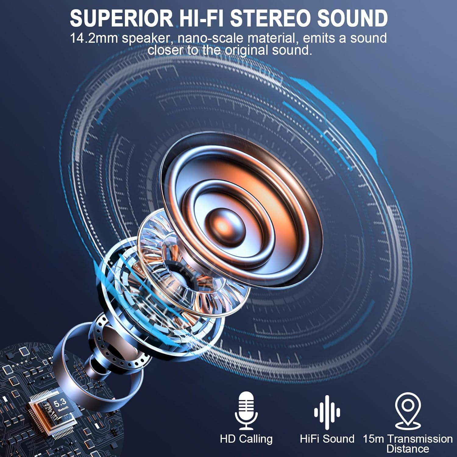 Bluetooth 5.3 technology extends transmission distance and reduces dropouts. Take out both earbuds and they will automatically power on and pair with each other.